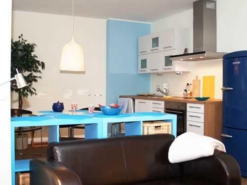 Herzstück der Wohnung ist der offene Wohn-Essbereich: Hier lädt die voll ausgestattete Küche zum gemeinsamen Kochen ein, während am Esstisch Platz für gesellige Mahlzeiten ist. Die gemütliche Sofa-Ecke mit TV sorgt für entspannte Abende.