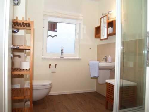 Das moderne Badezimmer ist mit Dusche, Waschbecken, WC und Fenster ausgestattet – hell, freundlich und funktional.