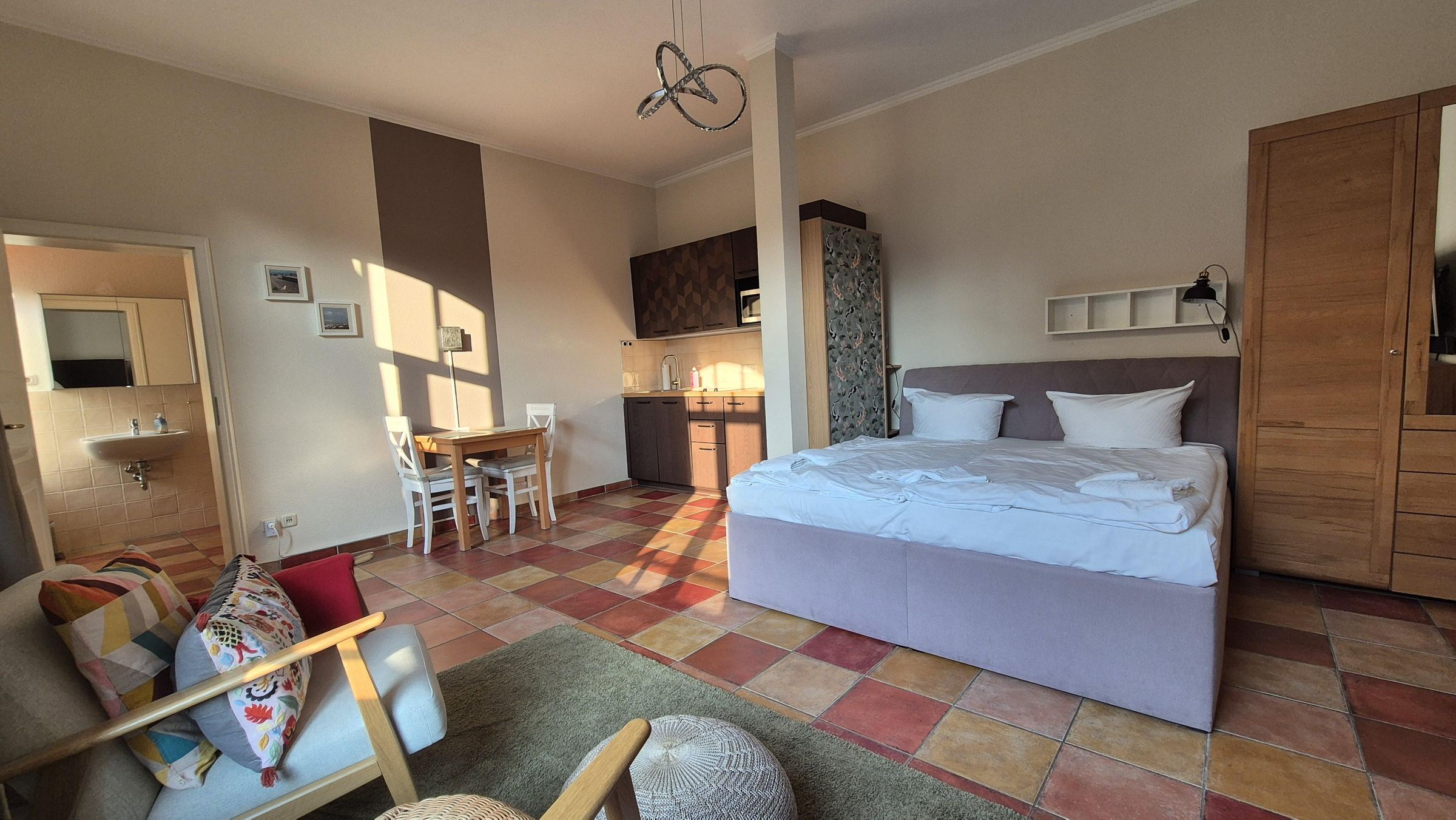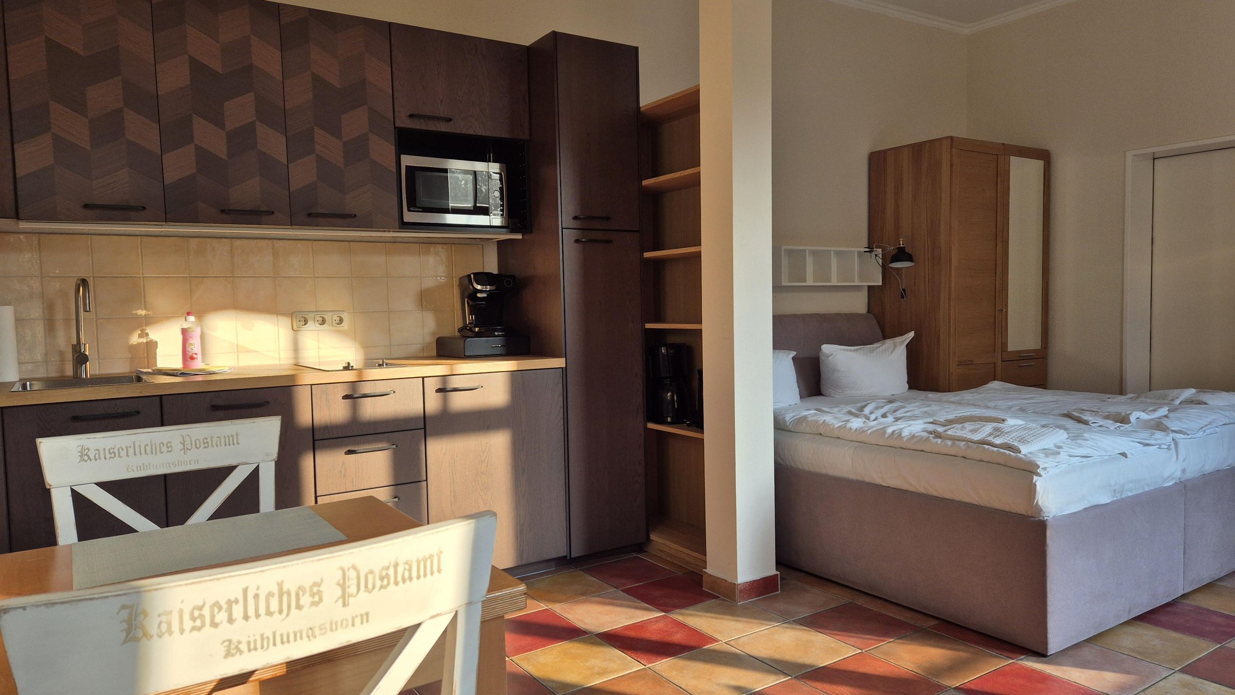 Willkommen in diesem stilvoll eingerichteten 1-Zimmer-Apartment mit ca. 28 m², ideal für einen entspannten Aufenthalt zu zweit. Ruhig gelegen auf der straßenabgewandten Seite des Kaiserlichen Postamts und dennoch zentral – perfekt für alle, die Komfort und Lage schätzen. Das Apartment im Hochparterre überzeugt mit durchdachter Raumaufteilung. Ein gemütliches Doppelbett, eine kleine Sitzecke mit Sesseln, eine moderne Pantryküche mit Geschirrspüler, sowie ein heller Essbereich sorgen für eine wohnliche Atmosphäre. Das Duschbad ist kompakt und funktional.