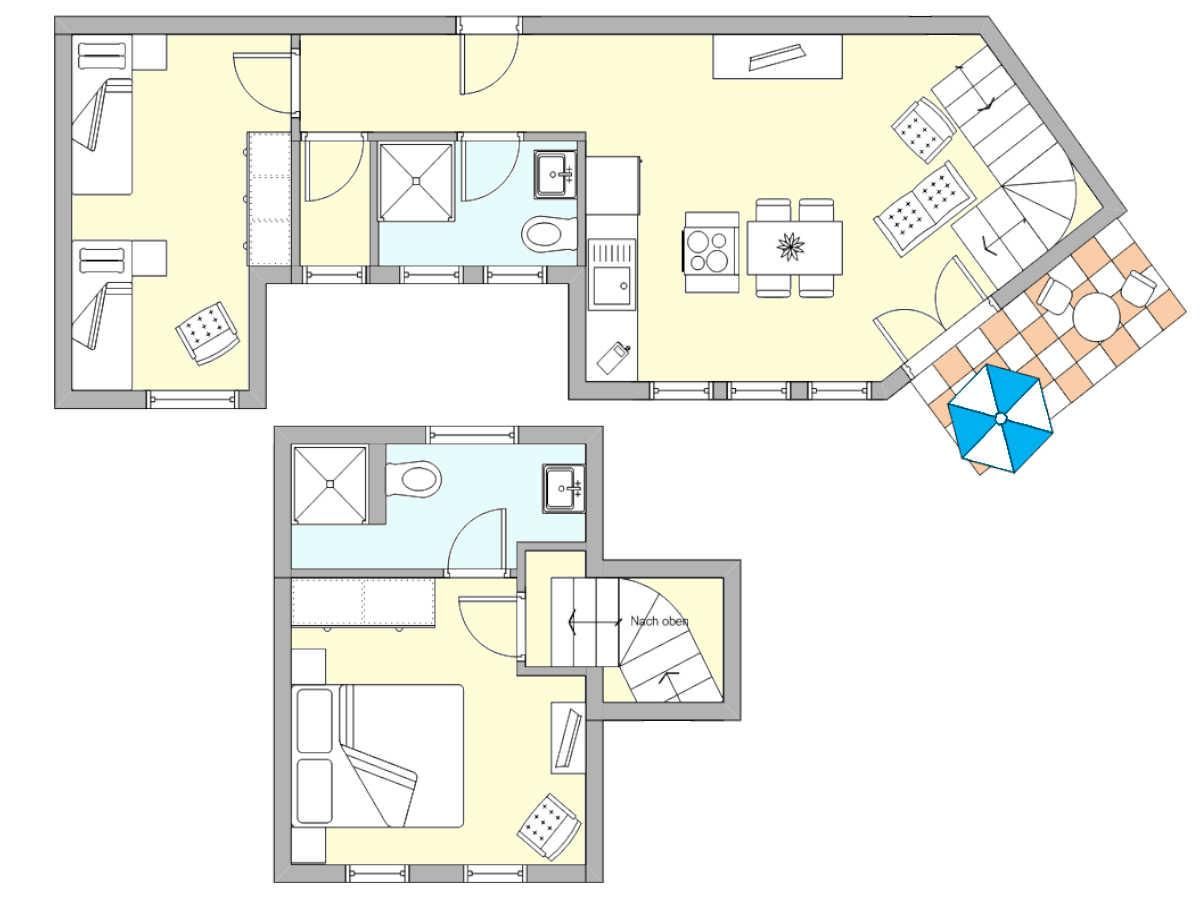 Die geschmackvolle Einrichtung, kombiniert mit einer außergewöhnlichen Raumaufteilung über zwei Ebenen, schafft ein einzigartiges Wohngefühl. Vom hellen Wohn- und Essbereich mit gemütlicher Sitzecke, TV und Esstisch führt eine elegante Wendeltreppe in das obere Stockwerk – direkt in das beeindruckende „Turmzimmer“, ein Schlafzimmer mit Doppelbett, ein weiteres Schlafzimmer mit zwei Einzelbetten und großem Kleiderschrank. Von hier genießen Sie einen herrlichen Blick über das historische Ensemble des Kaiserlichen Postamts.