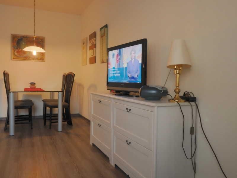Im großzügigen Wohnzimmer erwarten Sie eine gemütliche Sitzecke mit Couchtisch, ein modernes Sideboard, ein Flachbild-TV sowie ein praktisches Schrankbett – ideal für erholsame Nächte. Der angrenzende Essbereich mit großem Tisch und vier Stühlen lädt zu geselligen Mahlzeiten ein.