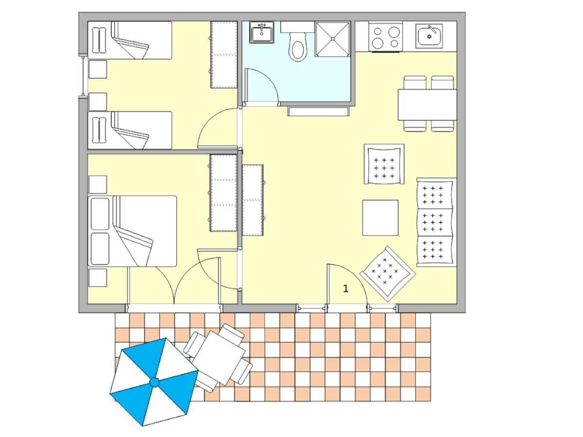Diese stilvolle 60 m² große 3-Zimmer-Ferienwohnung im Erdgeschoss bietet alles, was Sie für einen erholsamen Urlaub benötigen. Über die eigene Terrasse mit Gartenmöbeln betreten Sie Ihr persönliches Urlaubsdomizil– ein idealer Ort für sonnige Frühstücksmomente oder entspannte Abende im Freien.